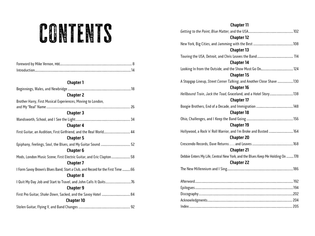 Kim Simmonds (1947–2022) was a British blues-rock guitarist and the founder of Savoy Brown and was known for his fiery solos and pioneering British blues from the 1960s onward.Debbie Lyons Simmonds met Kim in 1991 at, as you guessed, a gig. They were together for the next 31 years, until Kim’s passing. Kim’s dream was publishing this book, and working on this has brought her even closer to him. She is thrilled to make this book a reality and is even more excited to share it with everyone. She resides in New York with her family and pets.Mike Vernon’s credits include producing some of the all-time great artists, such as Savoy Brown, Eric Clapton, David Bowie, John Mayall, Ten Years After, Peter Green, and Fleetwood Mac. Vernon still works in music to this day, most recently with his new formed band Cat Squirrel.